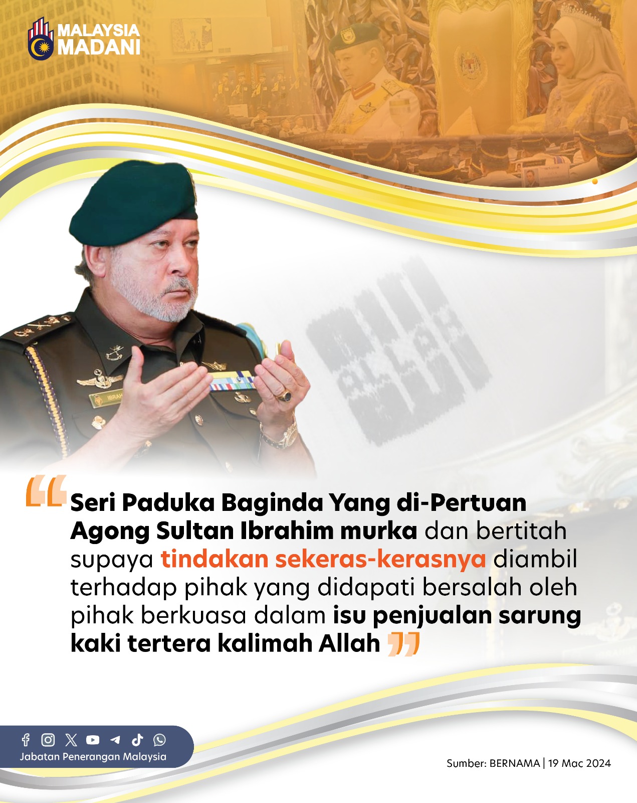 SERI PADUKA BAGINDA YANG DI-PERTUAN AGONG SULTAN IBRAHIM MURKA DAN BERTITAH SUPAYA TINDAKAN SEKERAS-KERASNYA DIAMBIL TERHADAP PIHAK YANG DIDAPATI BERSALAH OLEH PIHAK YANG DIDAPATI BERSALAH OLEH PIHAK BERKUASA DALAM ISU PENJUALAN SARUNG KAKI TERTERA KALIMAH ALLAH