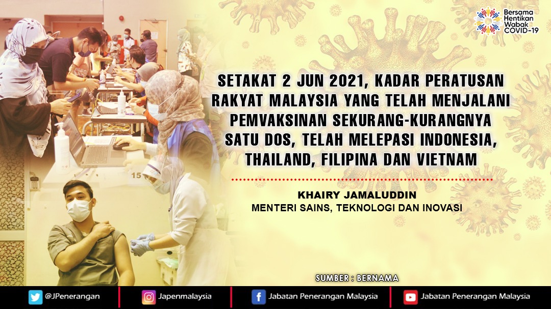 SETAKAT 2 JUN 2021 KADAR PERATUSAN RAKYAT MALAYSIA YANG TELAH MENJALANI PEMVAKSINAN SEKURANG-KURANGNYA SATU DOS TELAH MELEPASI INDONESIA, THAILAND , FILIPINA DAN VIETNAM