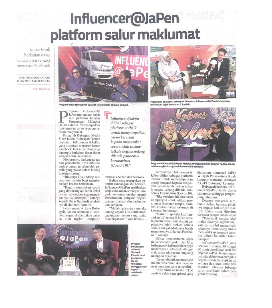SINAR HARIAN | 3.11.2020 (SELASA) | M/S : 12 | INFLUNCER@JAPEN PLATFORM SALUR MAKLUMAT
