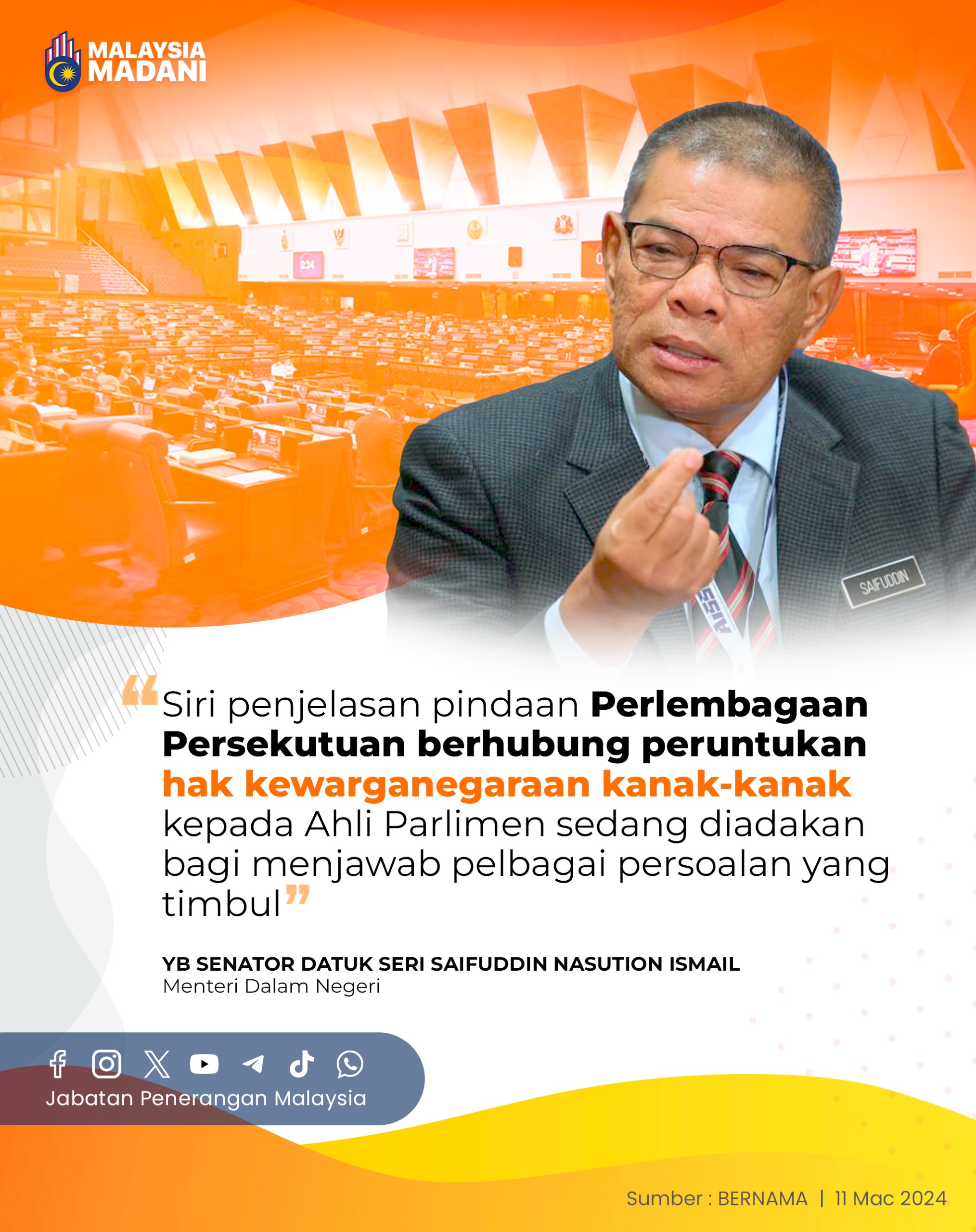 SIRI PENJELASAN PINDAAN PERLEMBAGAAN PERSEKUTUAN BERHUBUNG PERUNTUKAN HAK KEWARGANEGARAAN KANAK-KANAK KEPADA AHLI PARLIMEN SEDANG DIADAKAN BAGI MENJAAB PELBAGAI PERSOALAN YANG TIMBUL
