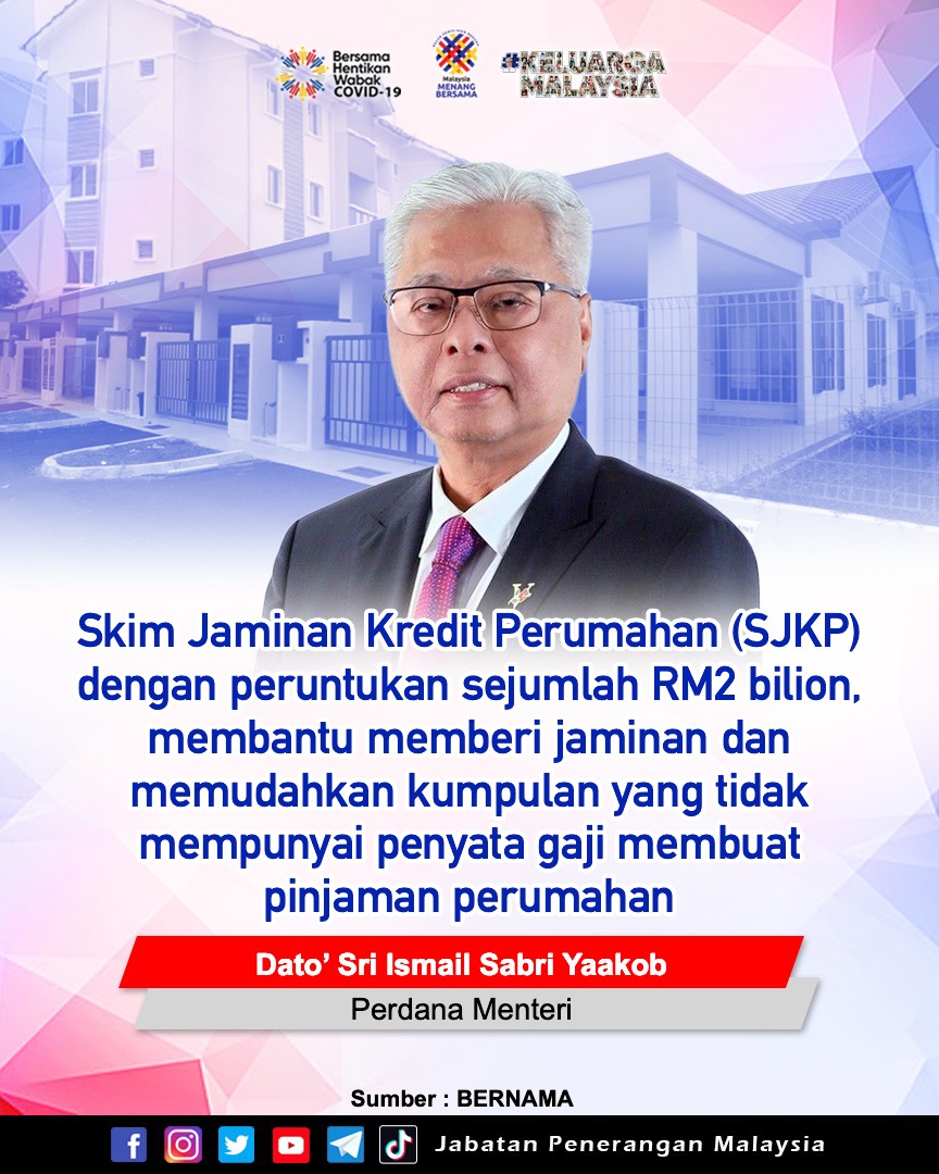 SKIM JAMINAN KREDIT PERUMAHAN (SJKP) DENGAN PERUNTUKAN SEJUMLAH RM2 BILION, MEMBANTU MEMBERI JAMINAN DAN MEMUDAHKAN KUMPULAN YANG TIDAK MEMPUNYAI PENYATA GAJI MEMBUAT PINJAMAN PERUMAHAN