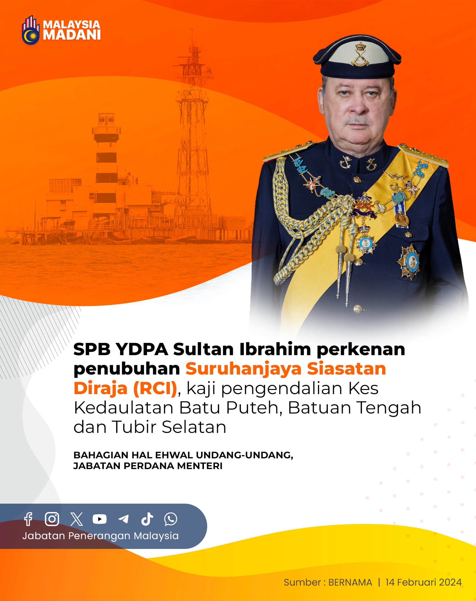 SPB YDPA SULTAN IBRAHIM PERKENAN PENUBUHAN SURUHANJAYA SIASATAN DIRAJA (RCI), KAJI PENGENDALIAN KES KEDAULATAN BATU PUTEH, BATUAN TENGAH DAN TUBIR SELATAN