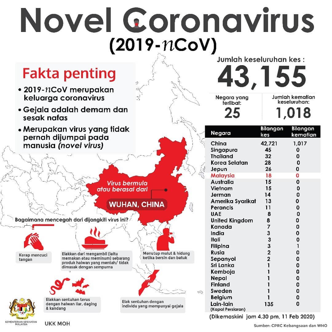 [vc_row][vc_column][vc_empty_space][vc_single_image image=”3522″ img_size=”full” alignment=”center”][vc_column_text]Status terkini pada jam 4.30 petang, 11 Februari 2020 bagi kes Novel Coronavirus (2019-nCoV). Statistik KKM adalah mengikut statistik terkini yang dikeluarkan oleh WHO yang menjadi pusat data dan statistik kes novel coronavirus (2019-nCoV) dari semua negara yang dijangkiti.