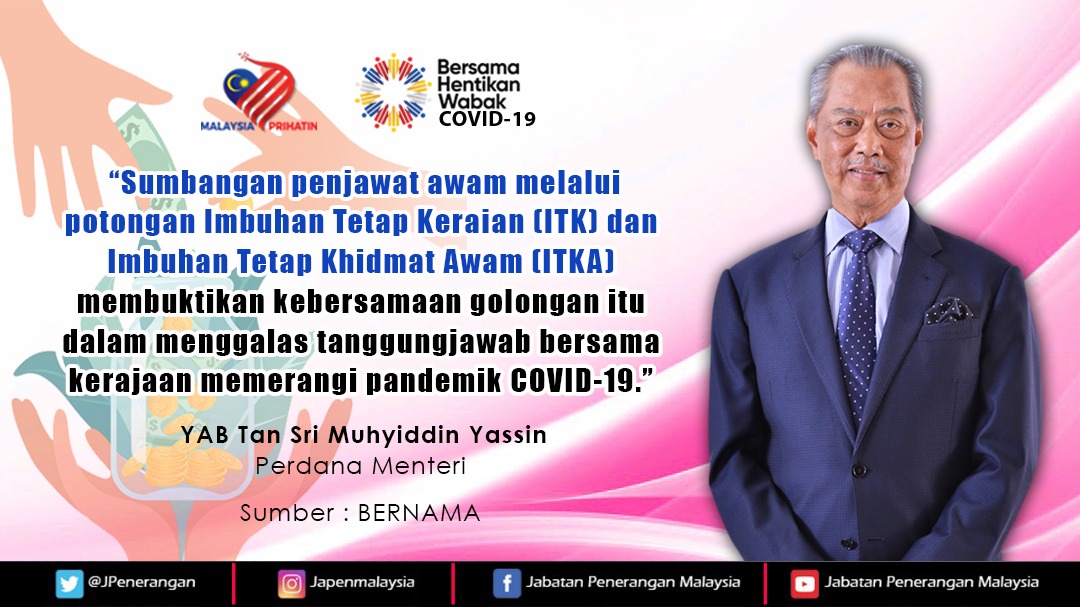 SUMBANGAN PENJAWAT AWAM MELALUI POTONGAN IMBUHAN TETAP KERAIAN DAN IMBUHAN TETAP KHIDMAT AWAM MEMBUKTIKAN KEBERSAMAAN GOLONGAN ITU DALAM MENGGALAS TANGGUNGJAWAB BERSAMA KERAJAAN MEMERANGI PANDEMIK COVID 19