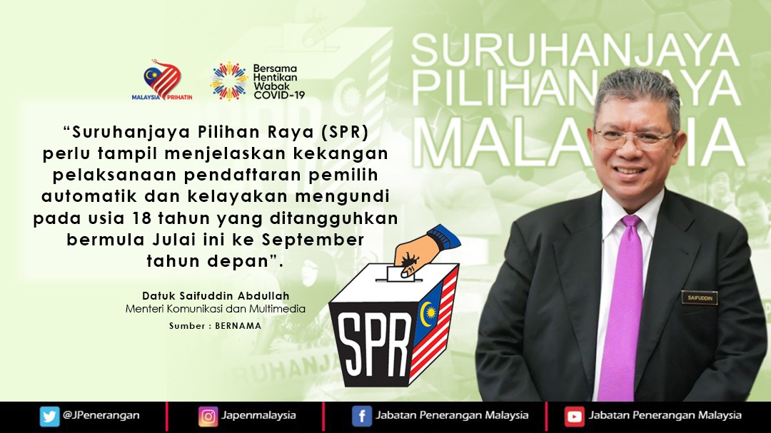 SURUHANJAYA PILIHAN RAYA SPR PERLU TAMPIL MENJELASKAN KEKANGAN PELAKSANAAN PENDAFTARAN PEMILIH AUTOMATIK DAN KELAYAKAN MENGUNDI PADA USIA 18 TAHUN YANG DITANGGUHKAN BERMULA JULAI INI KE SEPTEMBER TAHUN DEPAN
