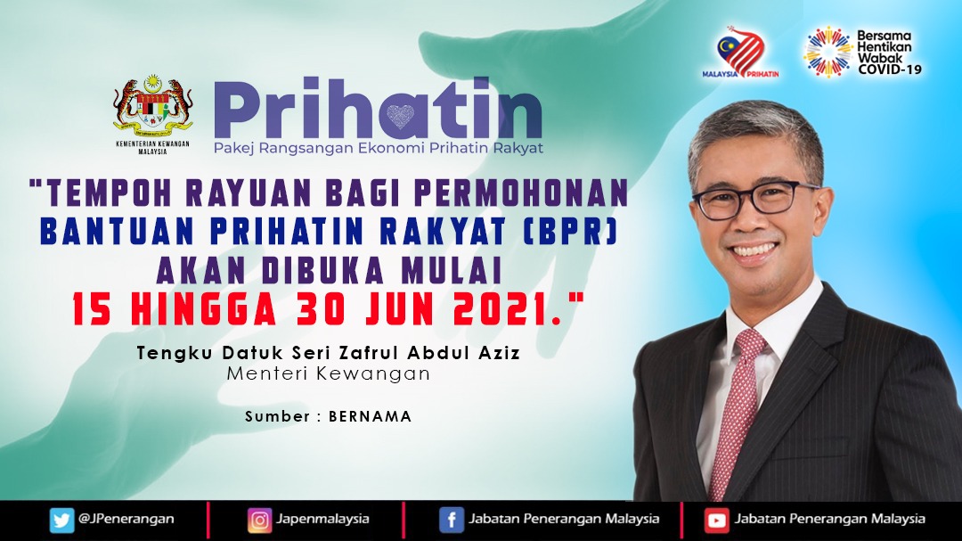TEMPOH RAYUAN BAGI PERMOHONAN BANTUAN PRIHATIN RAKYAT BPR AKAN DIBUKA MULAI 15 HINGGA 30 JUN 2021