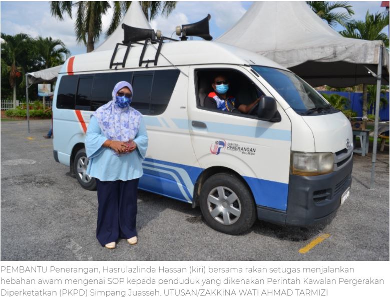 Pegawai Penerangan Daerah Kuala Pilah, Shaharuddin Daud @ Abu Hassan berkata, hebahan tersebut turut dilakukan pihaknya di kawasan yang berlaku peningkatan kes Covid-19 iaitu di kawasan Perintah Kawalan Pergerakan Diperketatkan (PKPD) Simpang Juasseh di sini.