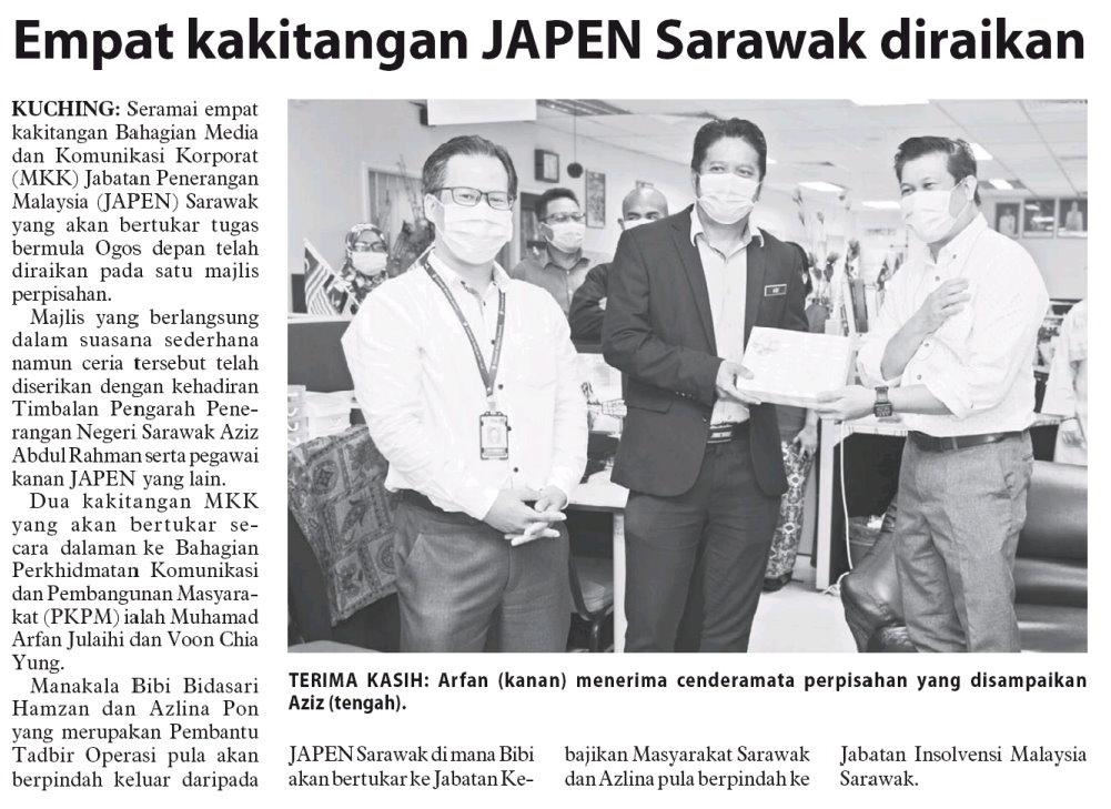 UTUSAN BORNEO SABAH | 31.7.2020 (JUMAAT) | M/S : | EMPAT KAKITANGAN JAPEN SARAWAK DIRAIKAN