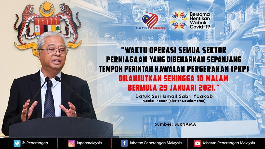 WAKTU OPERASI SEMUA SEKTOR PERNIAGAAN YANG DIBENARKAN SEPANJANG TEMPOH PKP DILANJUTKAN SEHINGGA 10 MALAM BERMULA 29 JANUARI 2021