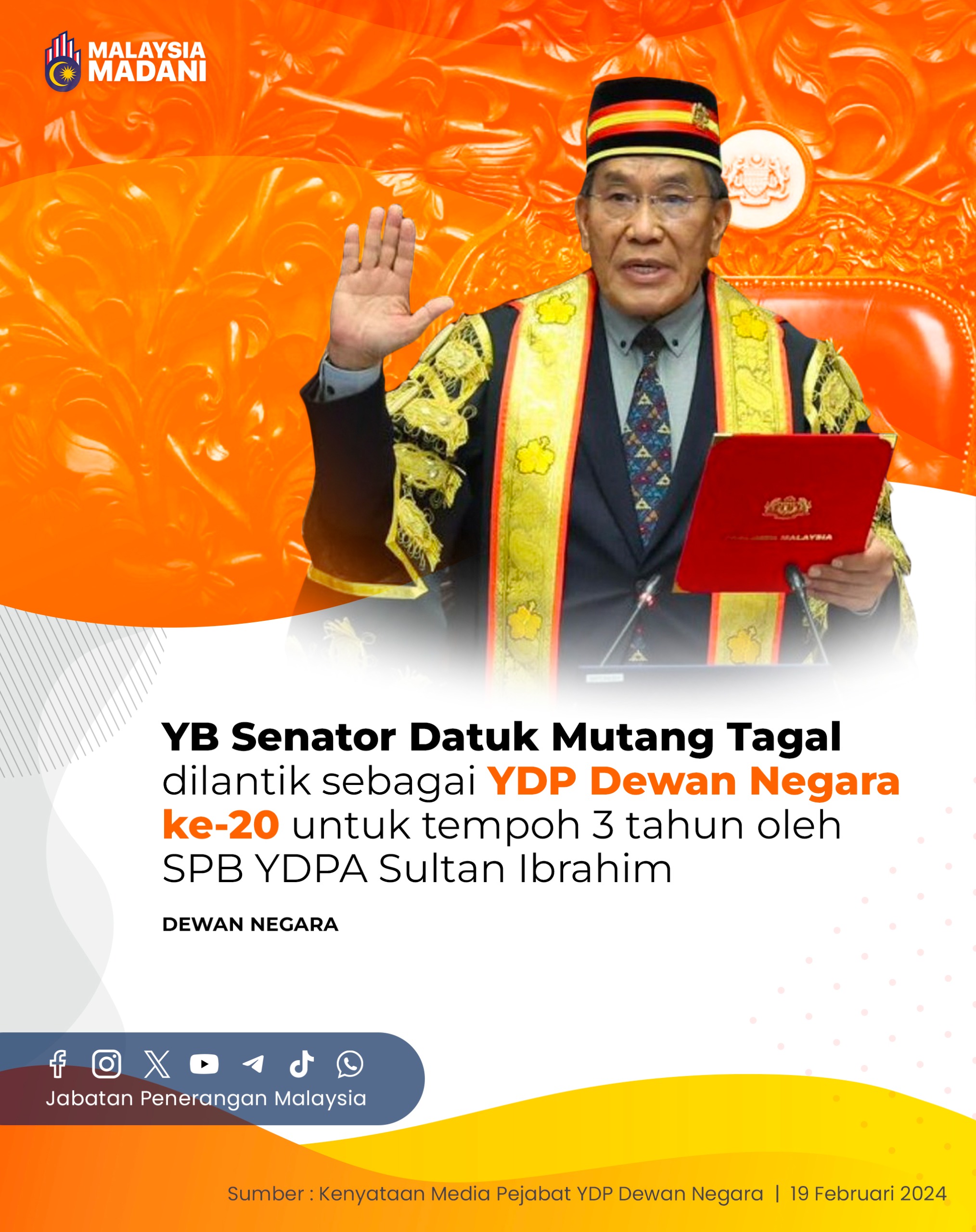 YB SENATOR DATUK MUTANG TAGAL DILANTIK SEBAGAI YDP DEWAN NEGARA KE-20 UNTUK TEMPOH 3 TAHUN OLEH SPB YDPA SULTAN IBRAHIM